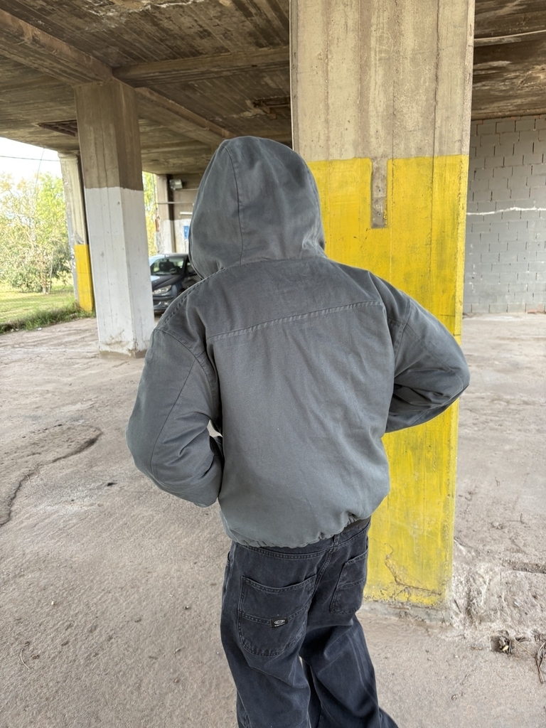 Campera gris confeccionada en gabardina premium con interior en guata negro mate.